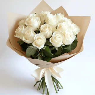 Этот нежный букет из 15 белых роз — символ чистоты и элегантности. Каждая роза, аккуратно собранная в стильную крафтовую упаковку, излучает светлую энергию и нежность. Атласная лента, завязанная с любовью, добавляет особый шарм. Такой букет станет прекрасным подарком для важных моментов в жизни — от романтического признания до жизнеутверждающих событий. Он создаст атмосферу уюта и радости, радую глаз и поднимая настроение каждому, кто его увидит.