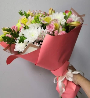Сочетая кустовые розы, изящные лилии, яркие альстромерии и пышные хризантемы, этот букет является шедевром флористического искусства. Каждый цветок тщательно подобран для создания утонченного, но яркого букета. Представленный в спокойной, нежной упаковке, он идеально подходит для важных моментов, подчеркивая красоту и оригинальность событий.